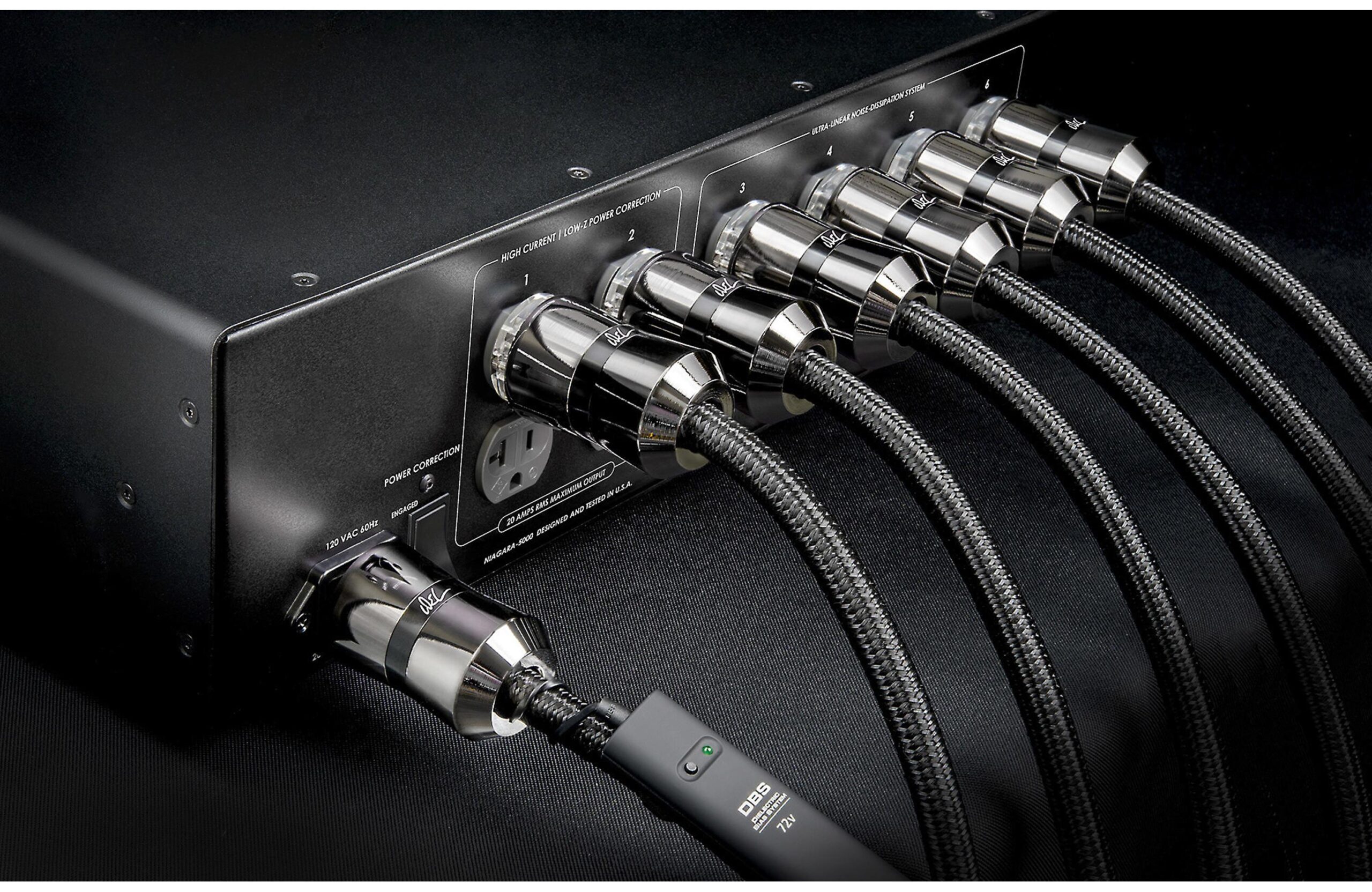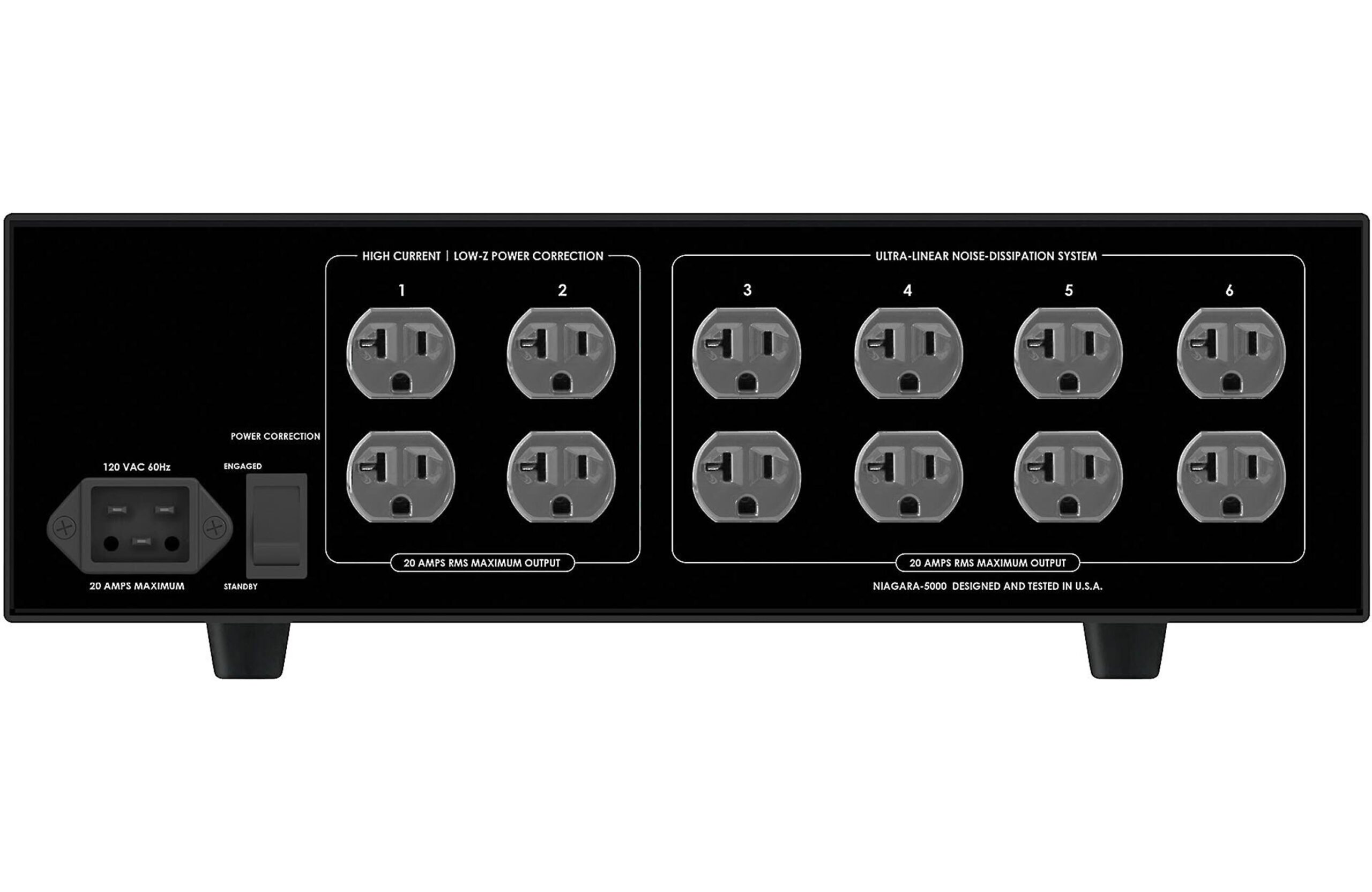 The Niagara 5000 has a total of twelve AC outlets to protect your entire A/V system. The four high-current outlets use AudioQuest’s unique Transient Power Correction Circuit. Boasting an instantaneous current reservoir of over 90 amps peak, the Niagara 5000 is specifically designed for today’s current-starved power amplifiers. Other AC power products feature high-current outlets that merely minimize current compression; the Niagara 5000 corrects it.