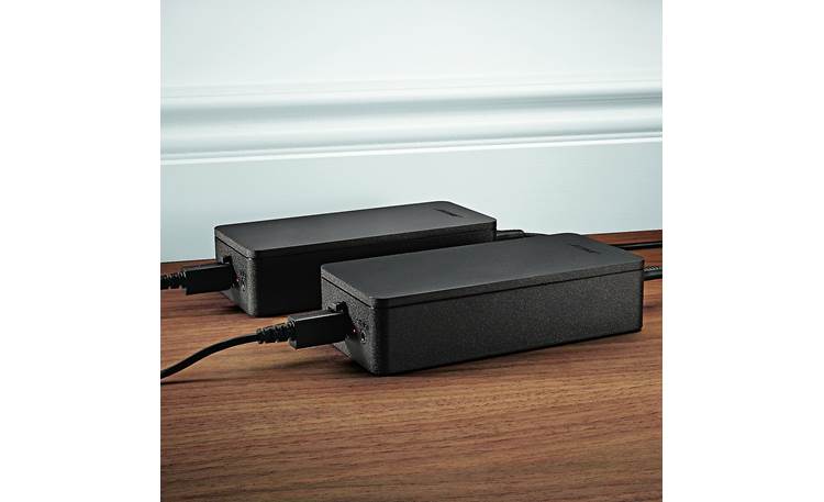 These speakers receive audio signals wirelessly, but there are still a couple of cables to connect. You don’t have to run any wires from the front to the back of your TV room because the speakers link up wirelessly with your sound bar. They do that via the included wireless receiver modules, which must be connected to AC power. Then you attach the receiver modules to the left and right rear speakers with the included speaker wire.