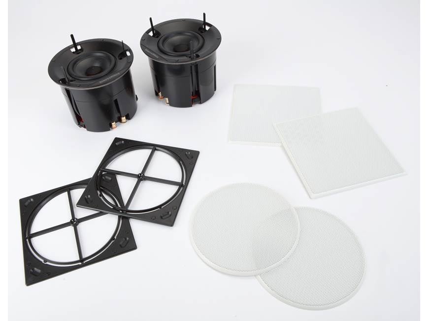 Round & Square Grilles:Â The Bowers & Wilkins CCM632 includes round and square grilles; choose the one that best fits your application. These easy-to-install magnetic grilles are paintable so you can match your decor. The round grille measures 5.75″ (diameter), while the square grille measures 6.0625″ (w) x 6.0625″ (h). The grilles protrude 0.25″ from the ceiling.