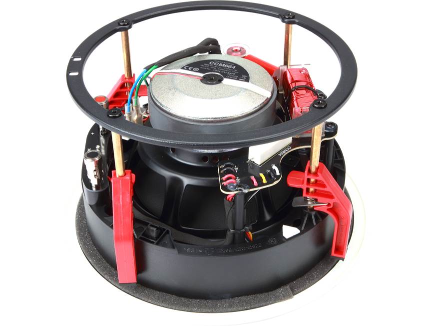 In-Ceiling Installation:Â The B&W CCM664 requires a round cutout and is secured in the ceiling via the included mounting frame with integrated “QuickDogs” spring-loaded clamps that tighten using phillips-head screws. The cutout will need to measure 8″ (diameter) x 5.25″ (depth). Make sure there is a least 0.75″ of clearance around the cutout opening for the integrated “QuickDogs” clamps. The mounting clamps will accommodate 0.25″ to 1″ thick drywall.