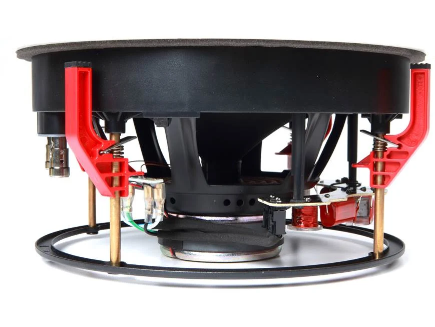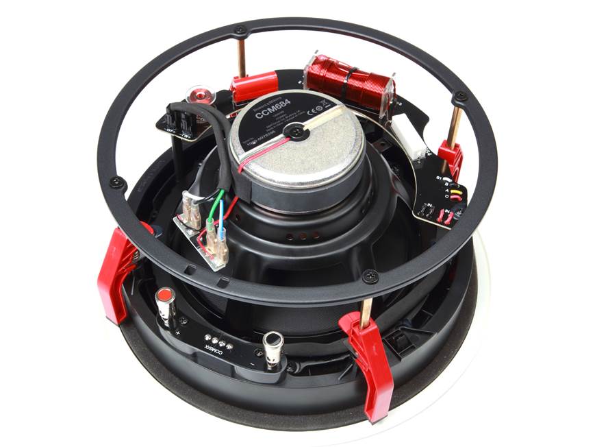 Spring-Post Terminals: The B&W CCM684 in-ceiling loudspeaker is outfitted with gold-plated, spring-post terminals that will accommodate bare speaker wire (up to 12AWG), pin connectors, and banana plugs (single only).
