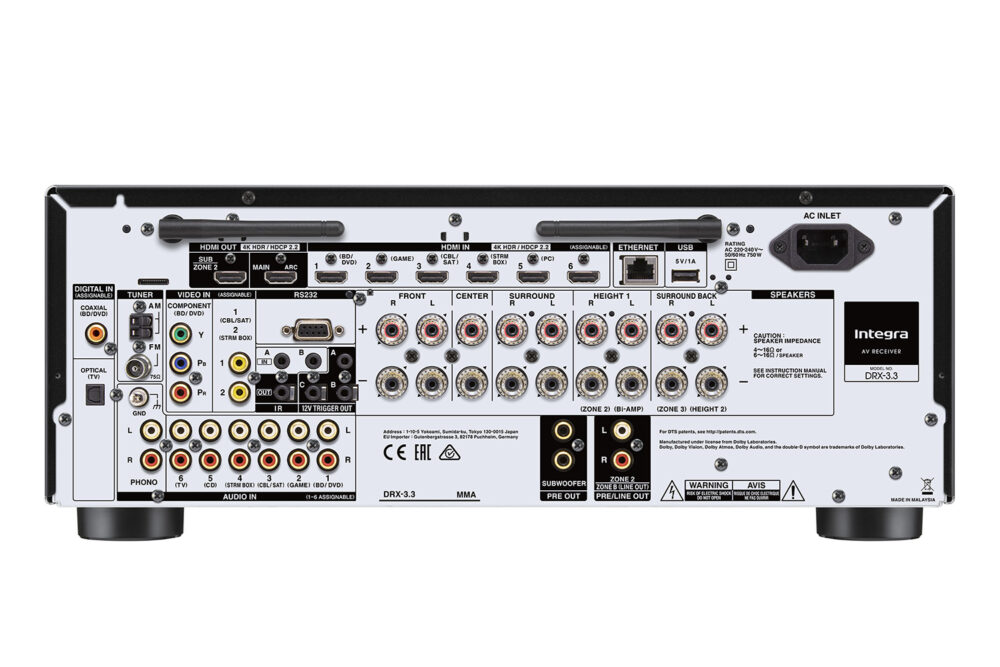 The DRX-3.3 lets you create atmospheres throughout your home with up to three-zone audio distribution and a new quad-core SoC supporting 802.11ac (MIMO) Wi-Fi® for network multi-room audio, all with up to 5.2.4 channels of immersive 3D sound for movies and games.