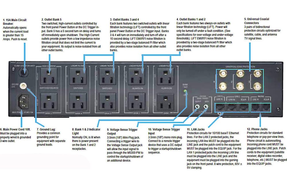 The M5300-PM also has two sets of protected Ethernet jacks, including one jack on the front panel, so you can surf the web without worry of power surges. A pair of protected telephone jacks prevents spikes from coming in through your phone line, while three sets of coaxial terminals shield your satellite, cable TV and antenna connections.