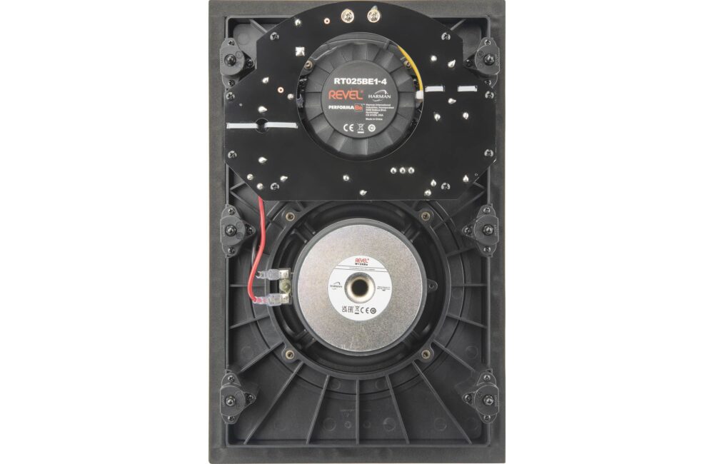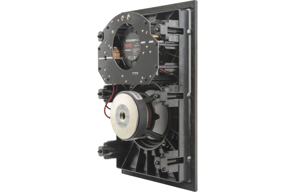 This high-quality in-wall speaker from Revel is ideal for an audiophile-grade music system, or as a front, side, or rear surround speaker in a high-end home theater setup. You’ll hear super-clear high-frequency detail from its 1” beryllium tweeter. Beryllium is known for being both ultra-light and very rigid — properties that allow the tweeter to deliver exquisitely smooth detail without distortion. Dual neodymium magnets control the tweeter’s movement with precision, and an acoustic lens waveguide provides a cohesive soundstage throughout your room.